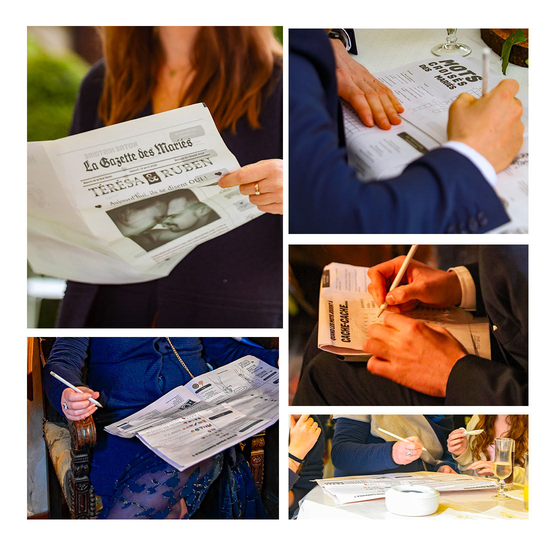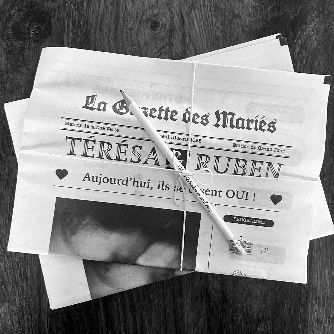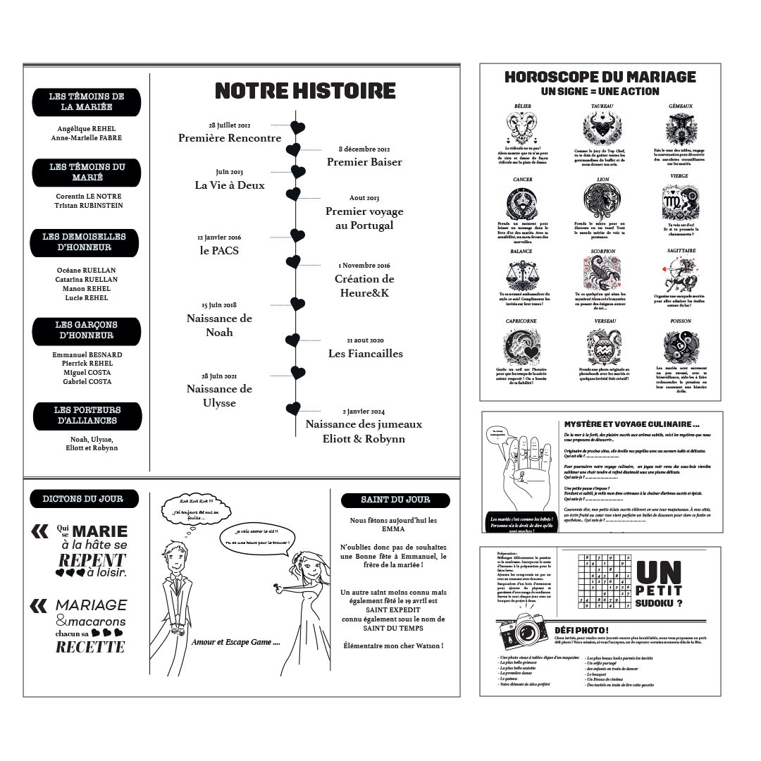 Pour notre mariage, j'ai imaginé cette gazette des mariés. Un petit journal en 2 phases à destination des invités pour raconter de manière graphique notre histoire et les inviter à la découvrir ou redécouvrir à travers des petites enquêtes.