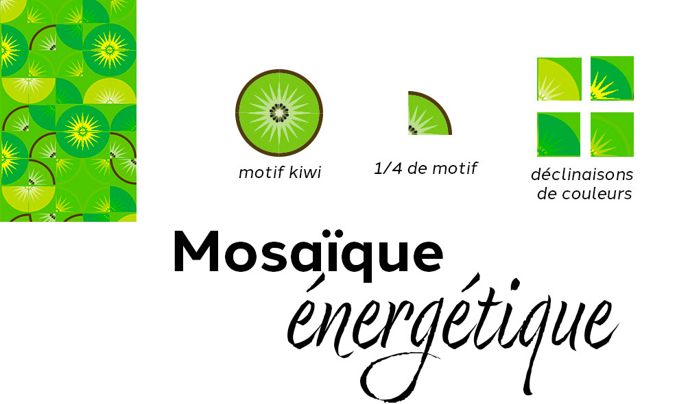 Les formes circulaires, inspirées de la structure du kiwi, sont multipliées et agencées de manière dense afin d’évoquer le mouvement, la diffusion progressive de l’énergie et une sensation de vitalité permanente. La répétition du motif renforce cette impression de flux, comme une énergie qui circule sans interruption autour du produit.