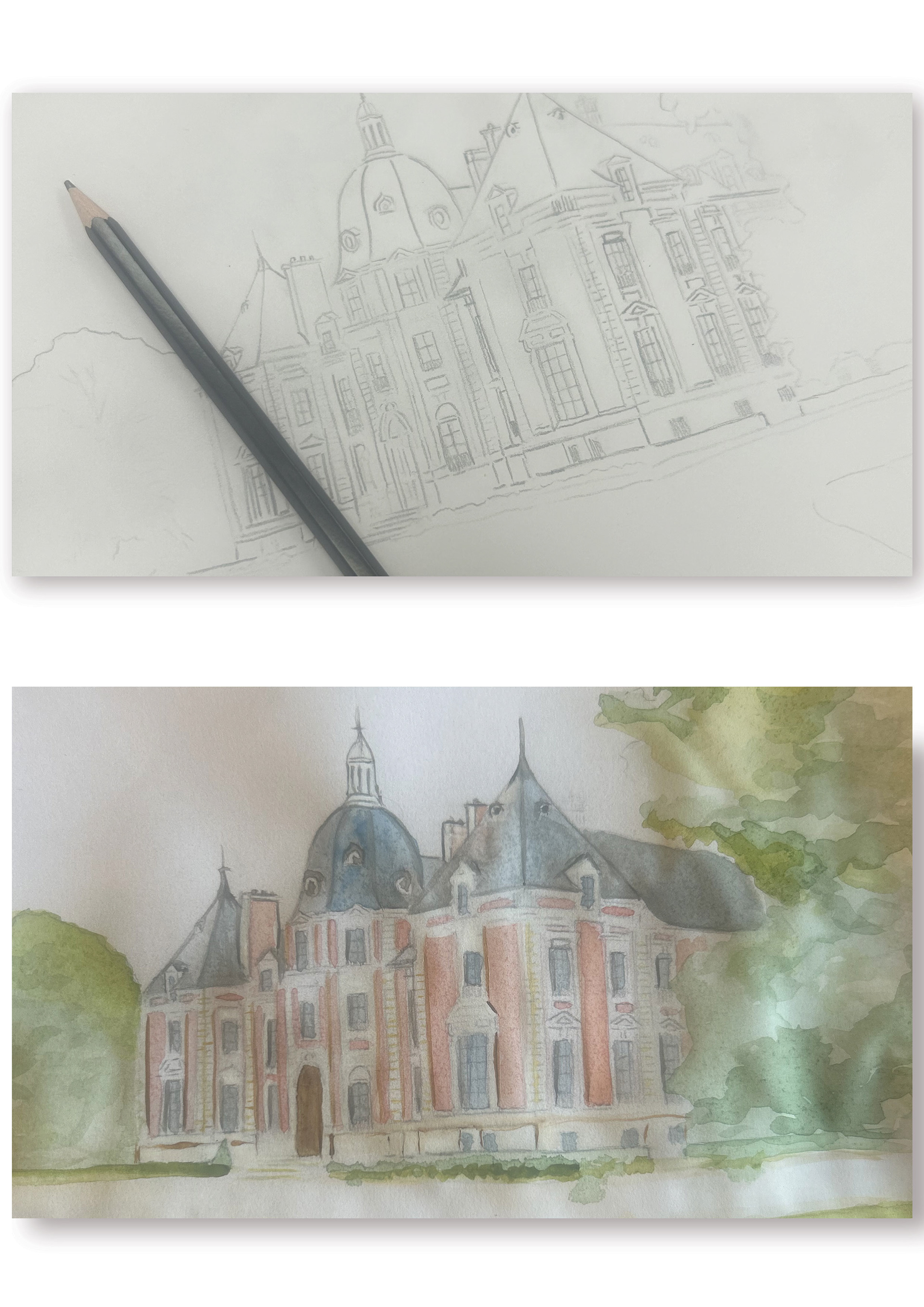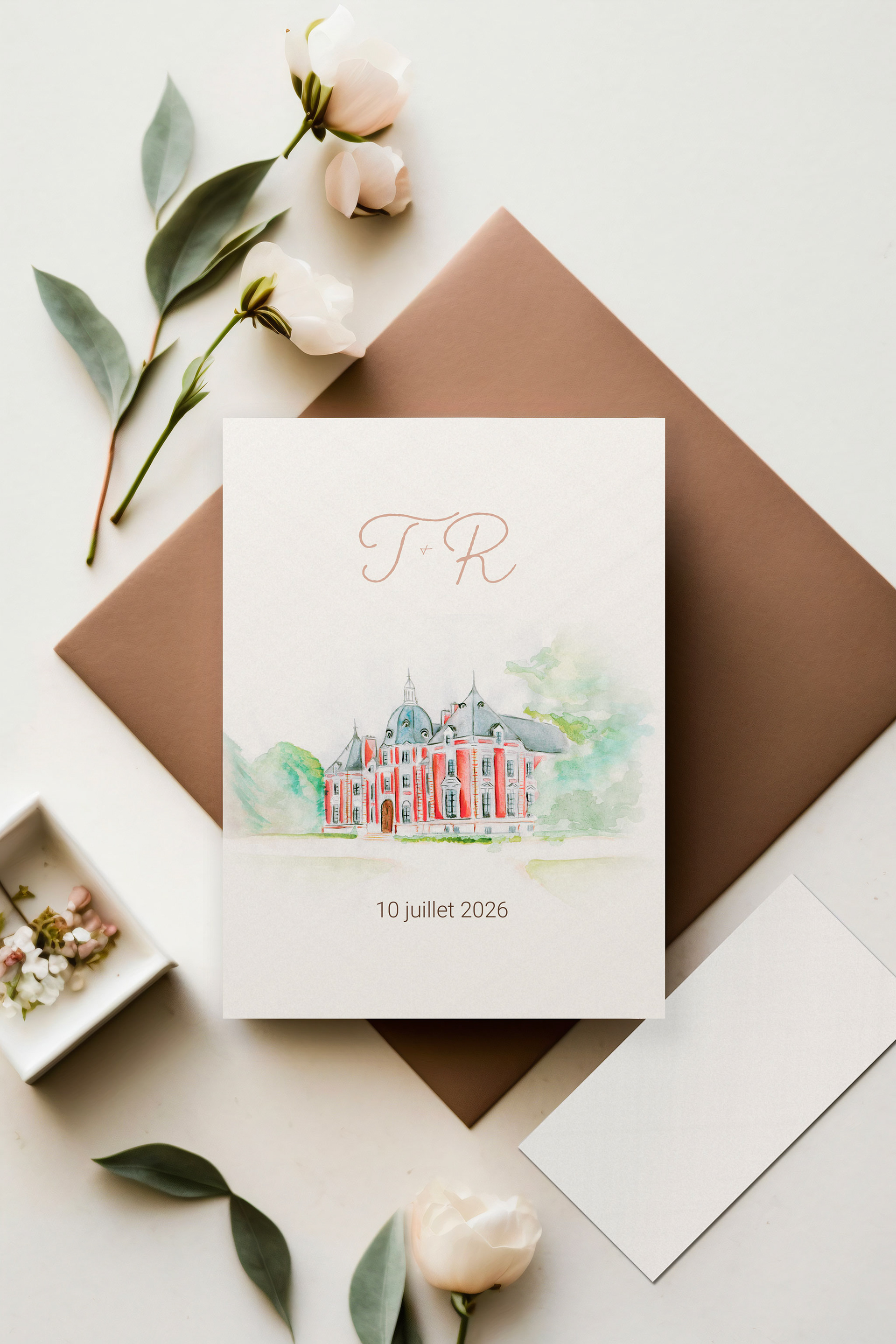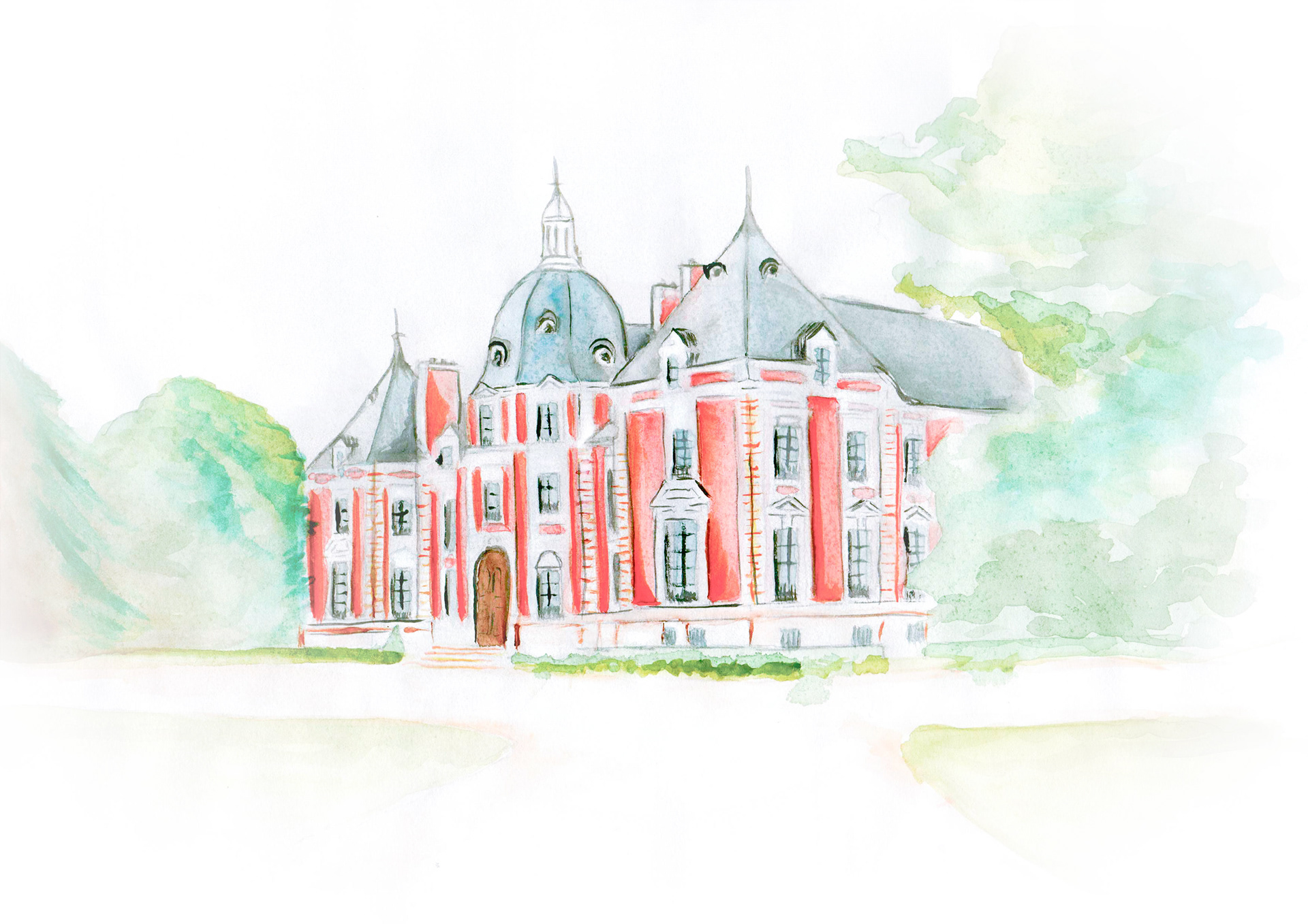 L’objectif : créer une illustration à l’aquarelle du lieu de réception afin d’en faire l’élément central de la papeterie.